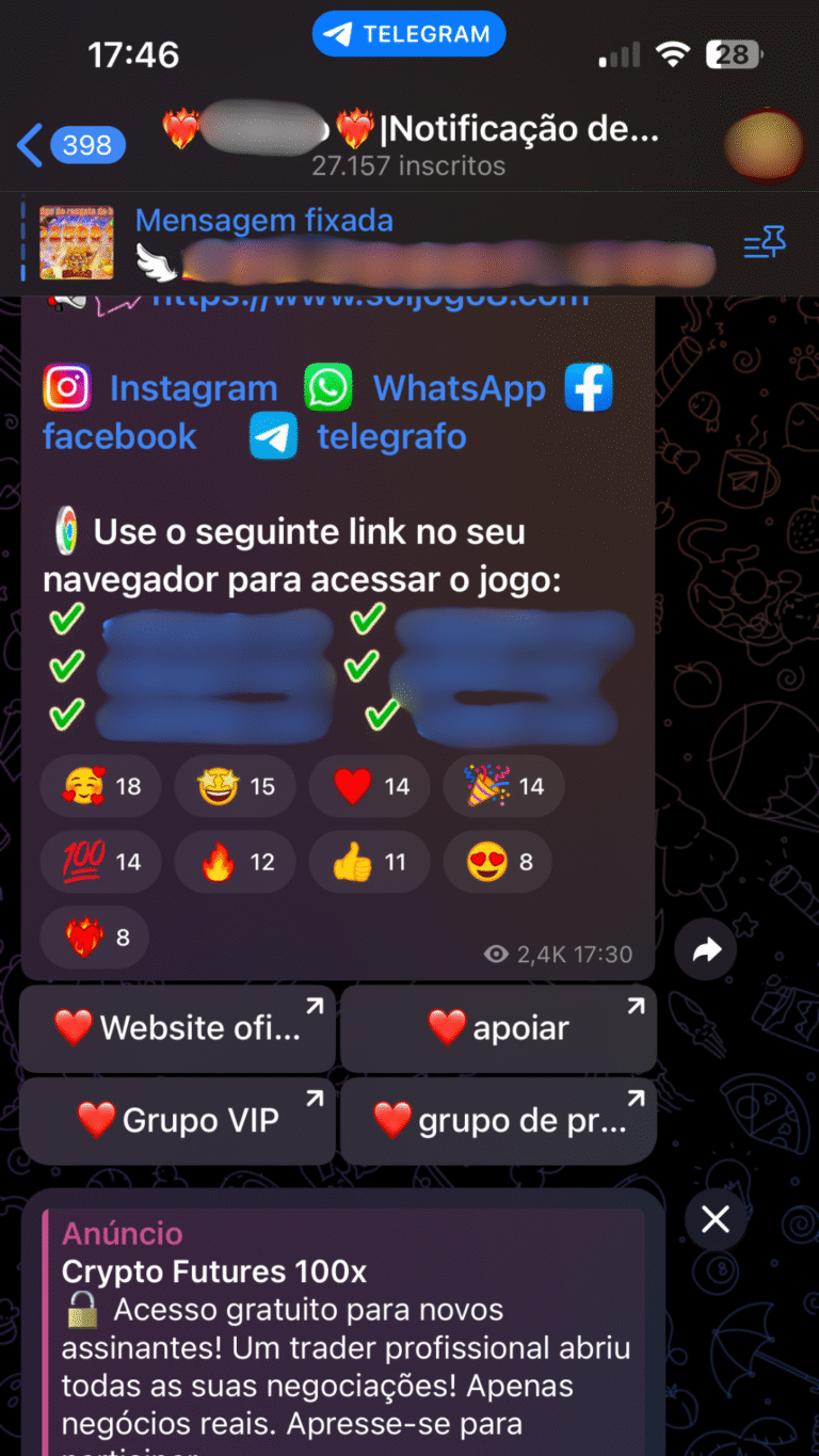 Nota: Evite enviar muitas mensagens em sequência (mais de 4 por minuto), para garantir o volume completo de reações e visualizações.
